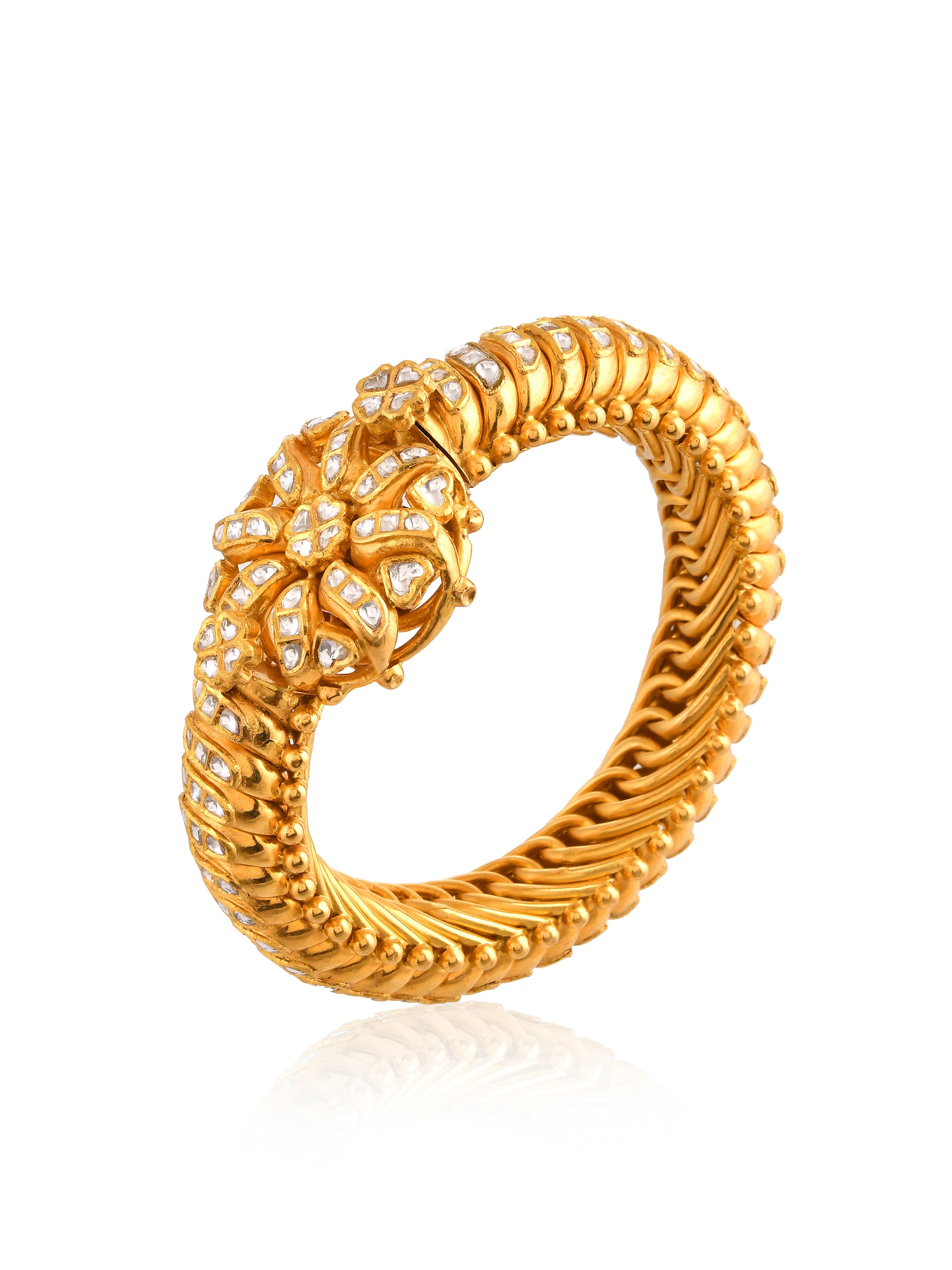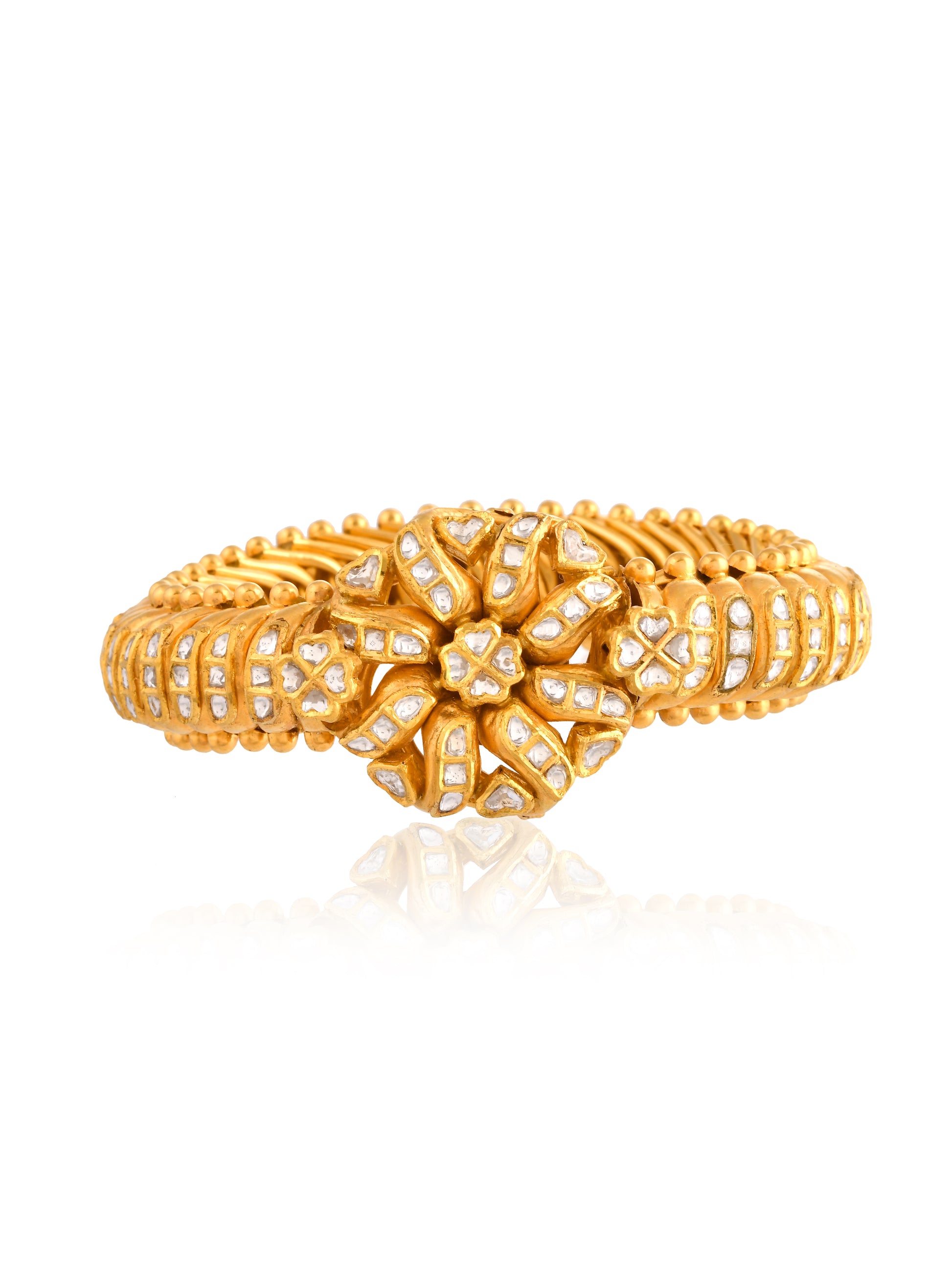 The Suraj Mukhi Kada symbolizes strength, prosperity, and radiance, designed in Jaipur’s signature Jadau style with raw Polki detailing. A true heirloom, it is an essential for traditional bridal collections and festive occasions.