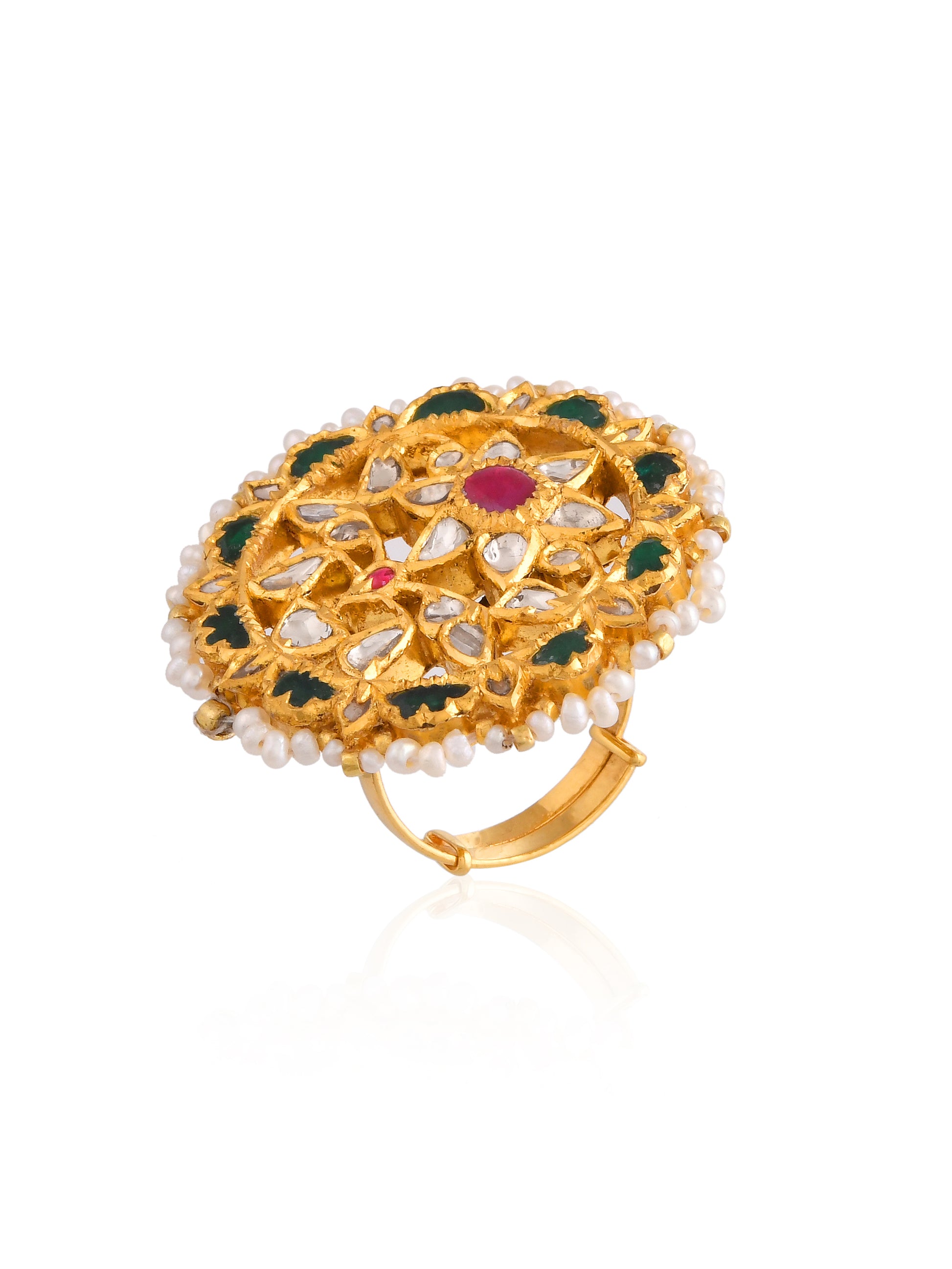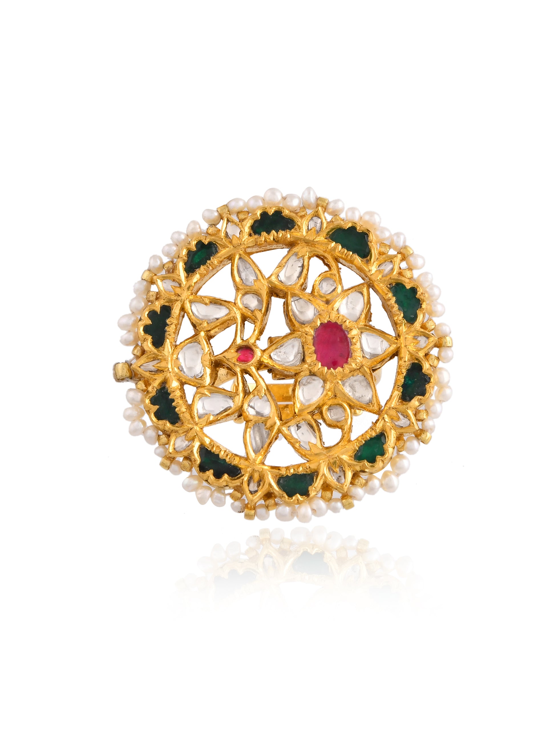 The Ghoomar Swirl Ring embodies movement and artistry. Featuring syndicate Polki in meticulous Jadau settings, Kala Johare creates a luxurious, bridal-ready piece that combines traditional motifs with contemporary elegance, highlighting raw Polki diamonds and expert craftsmanship.