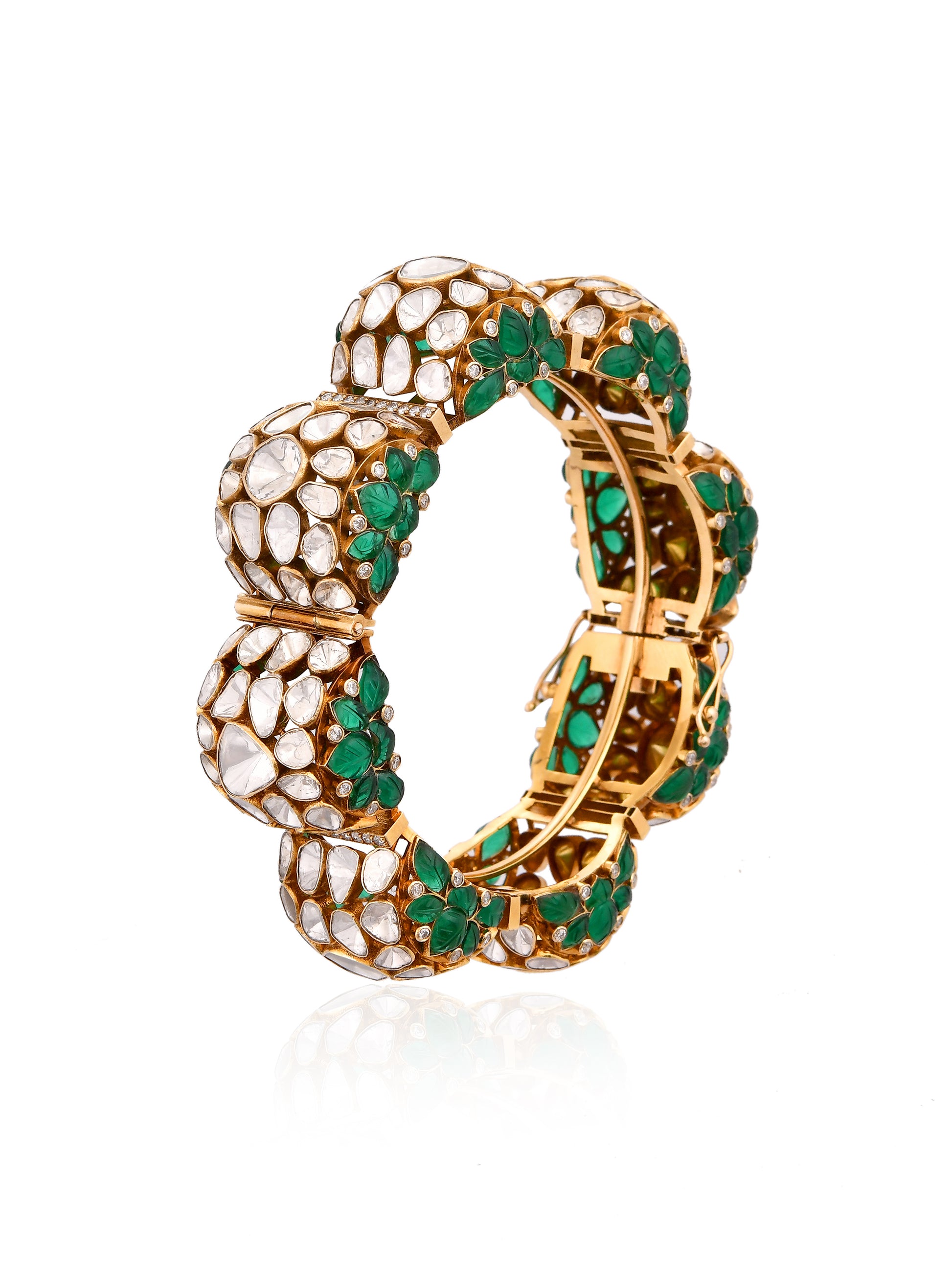 The Varnika Bangle features hand-set raw Polki diamonds in a traditional kundan setting. Reflecting Jaipur’s centuries-old craftsmanship, it is a versatile piece for both festive wear and bridal collections.